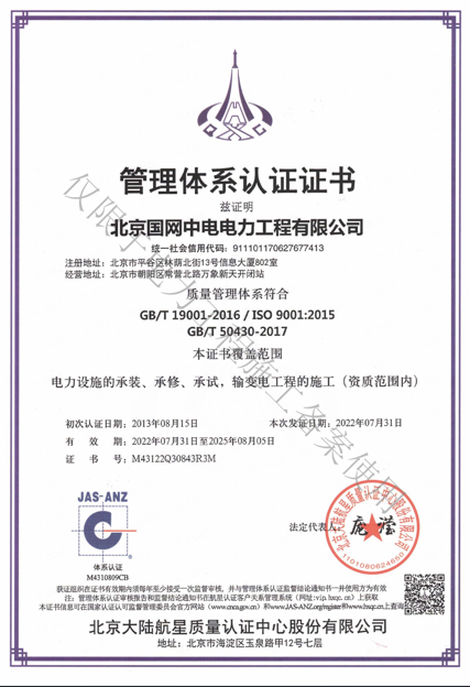 北京國網中電電力工程有限公司,已取得國家電監會頒發的《承裝(修、試)電力設施許可證》、為電力施工承裝四級、承修四級、承試四級企業。北京市住房和城鄉建設委員會頒發的房屋建筑施工總承包二級、機電設備安裝工程專業承包二級、輸變電專業承包二級、城市及道路照明工程專業承包二級、市政公用工程總承包二級資質、勞務不分等級,已通過ISO9001:2015 GB/T50430-2017質量管理體系、GB/T24001-2016/ISO 14001:2015環境管理體系、